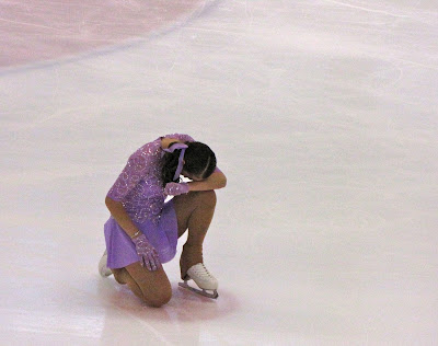 Tiu ĉi ne ploras pro fuŝaj movoj aŭ faloj sur la glacio. Ne, ŝi koncentriĝas antaŭ la komenco de la akompananta muziko. Ankaŭ ŝi falis post salto. Fakte nur la venkistino de la konkurso sukcesis plurfoje salt- turniĝi sen fali.